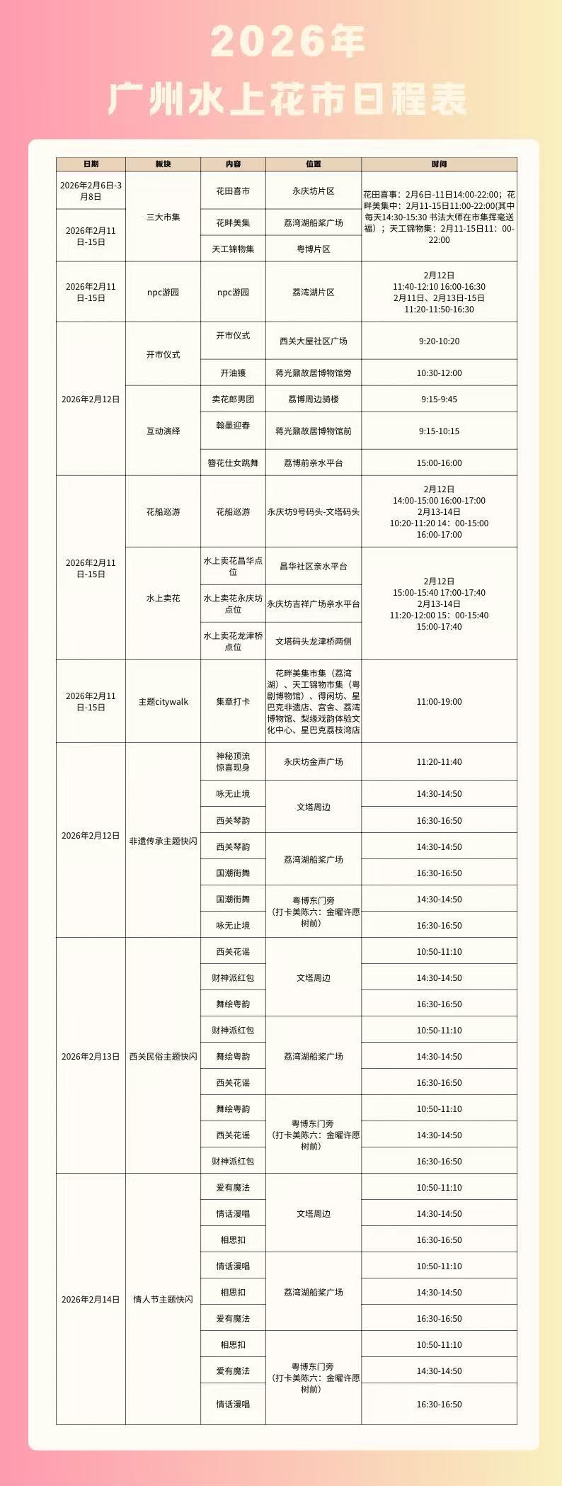2026年广州水上花市别出心裁,不仅扩大了花市观赏水域,从荔湾湖延伸至整个荔枝湾涌沿线、粤剧博物馆片区、永庆坊片区,还将在2月11-15日同步策划沿街、滨水市集,让市民游客在赏花惜春的同时,享受着旧时西关水乡市集的趣味。