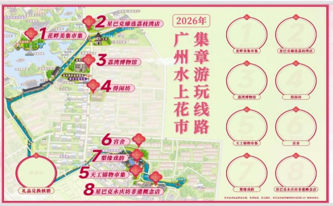 本次花市新增超人气集章活动,邀你开启“寻花启‘马’”之旅,在行走中探索西关韵味,收集满满福气!活动覆盖花畔美集市集(荔湾湖)、天工锦物市集(粤剧博物馆)、得闲坊、星巴克永庆坊非遗店、宫舍、荔湾博物馆、梨缘戏韵体验文化中心、星巴克荔枝湾店等花市核心区域与西关特色地标,打造覆盖全时段的水上花市Citywalk路线。